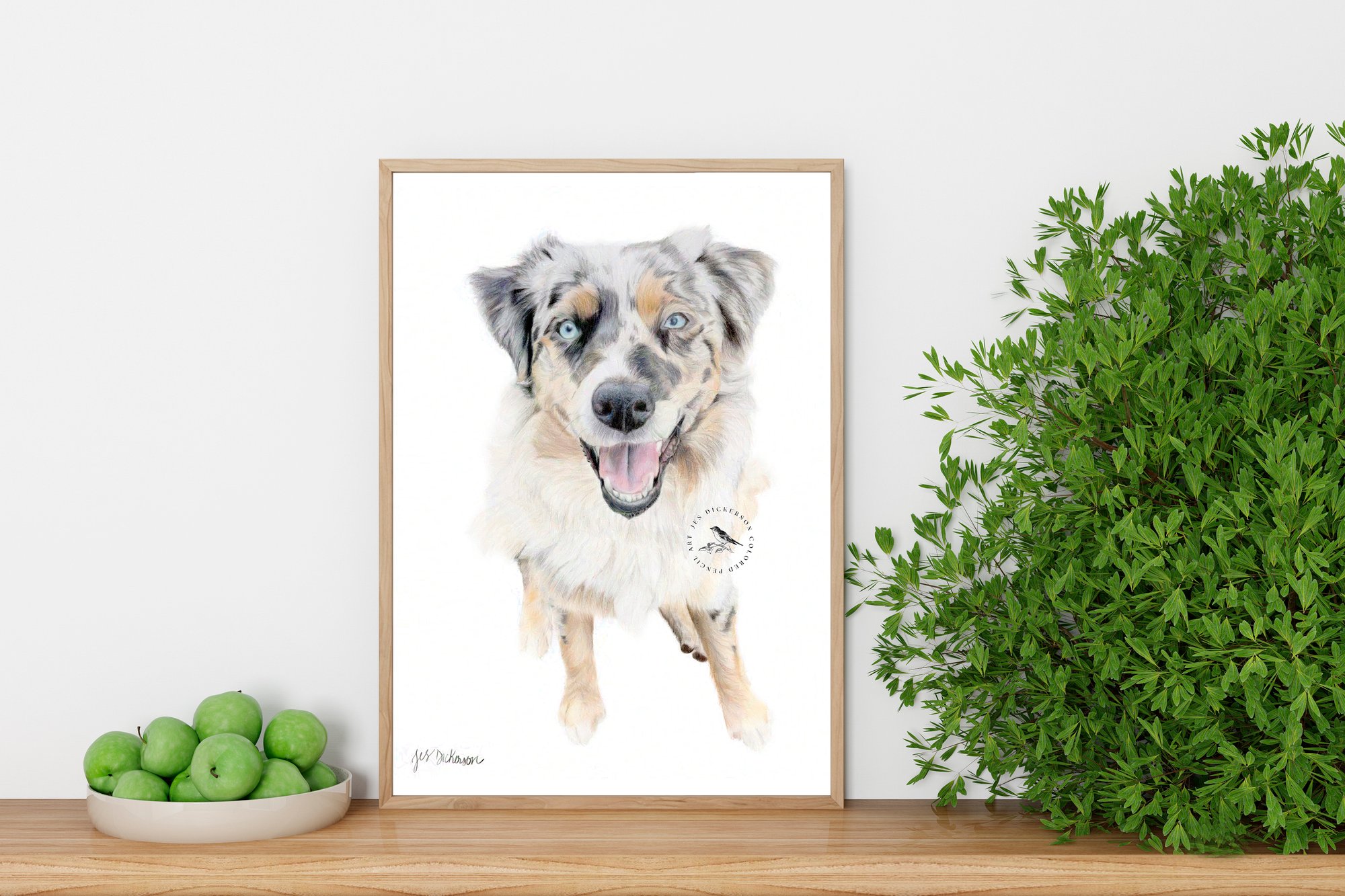 This original colored pencil dog portrait is of a happy Australian Shepherd. Austalian Shepherds are known for their energetic and intelligent natures, and you can see how this dog’s energy radiates off the page. His lovely blue merle fur with tan and white markings and those bright blue eyes made him a delight to draw.