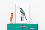 This print is of an original colored pencil portrait of an iridescent bird called a jacamar. Jacamars are tropical birds found in Mexico, Central and South America. They sit in this position waiting for larger bugs, such as dragonflies, to pass by so that they can snap them up. As I am already in love with the iridescent feathers of hummingbirds, I was instantly drawn to this charming little bird.