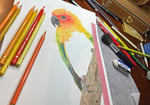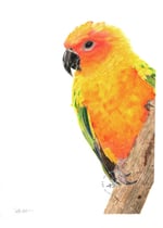Lean In is original colored pencil portrait is of sun conure. These bold, brightly colored birds are often kept as pets, but are now marked as endangered due to loss of habitat and pet trapping. It is estimated that more sun conures live in peoples homes than do in the wild at this time. This makes owning a portrait of a sun conure a much better choice than having one as a pet.