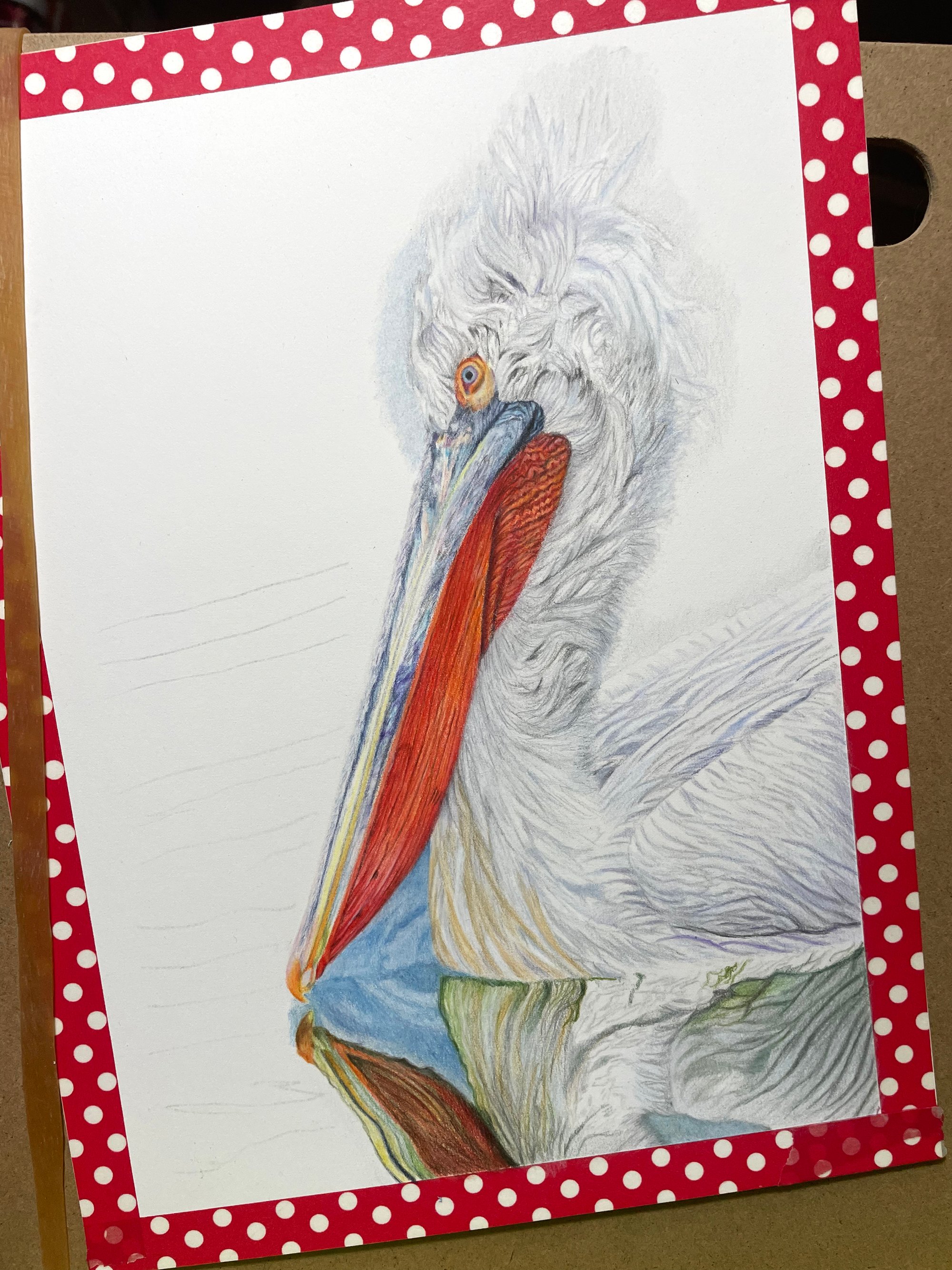 This is a print of an original colored pencil portrait of a pelican floating on the water. This portrait will always have a place in my heart because it was drawn at a very difficult time in my life. In February 2022 I fell while rollerblading and broke all 3 bones in my ankle and a bone in my leg. I had to have surgery and be non load bearing for months. I’m a very active person and the endless hours of sitting around with my leg elevated were torture. I was even unable to draw an my art desk because it hurt to not have my foot up. I finally figured out a way to draw using a large board and mason jars and bins in my jar. This pelican was drawn with me, leg in cast, sitting in a recliner surrounded by pencils. I took solace in the quiet scene and the hazy reflection of the pelican. I hope that his portrait can bring some calm and relaxation to the space you choose to hang it.