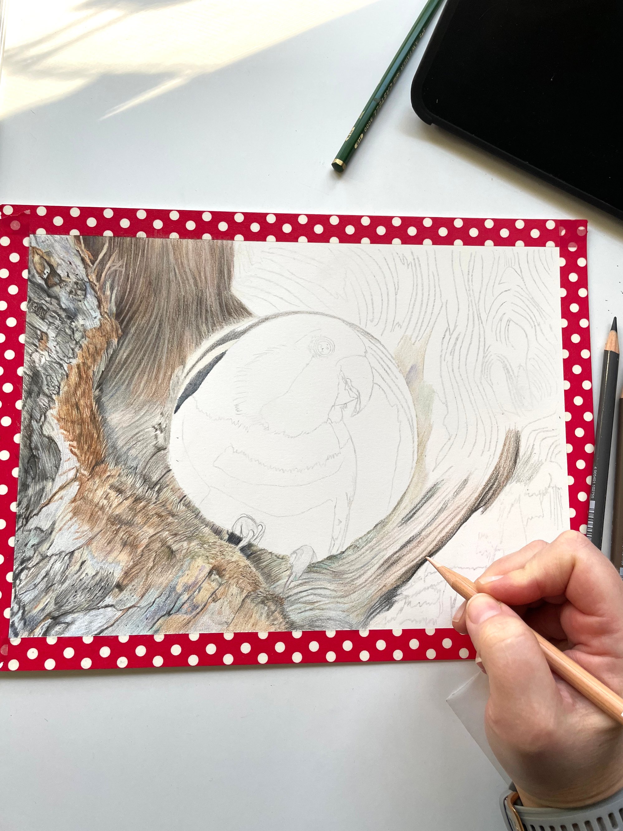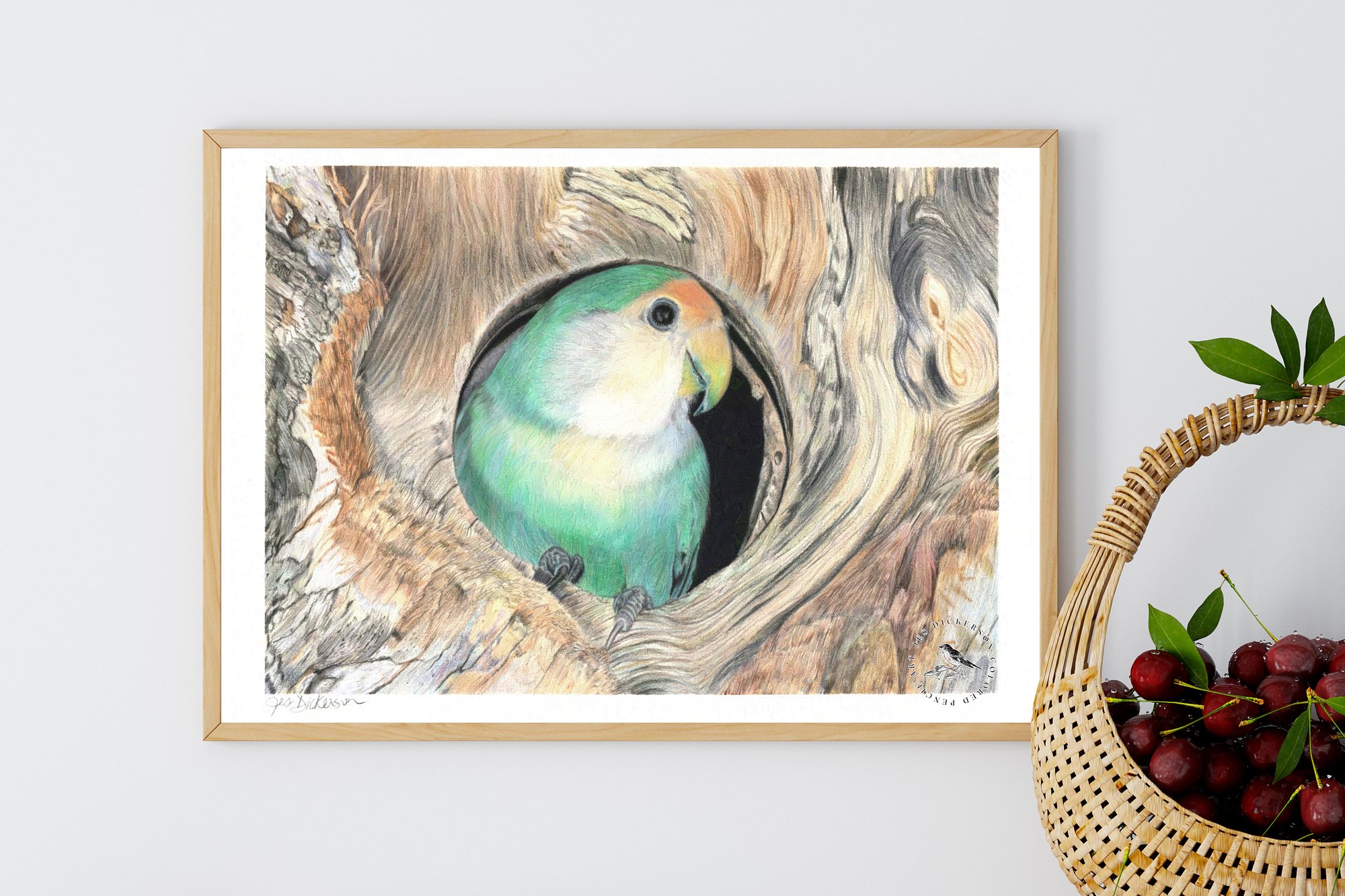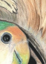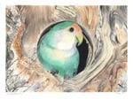 This is a print of an original colored pencil portrait of a lovebird peeking out from a tree hollow. I chose this drawing because of the fascinating contrast between the soft, smooth contrast of the lovebird’s feathers and the rough, coarse texture of the tree bark. Early in my career as an artist I was a scenic painter where I painted on huge scales for theatrical displays. Often I needed to paint textures such as brick and wood. This portrait gave me the opportunity to put that knowledge of wood to the test, but on a minute scale in a different medium and with a much more beautiful subject to go with it.
